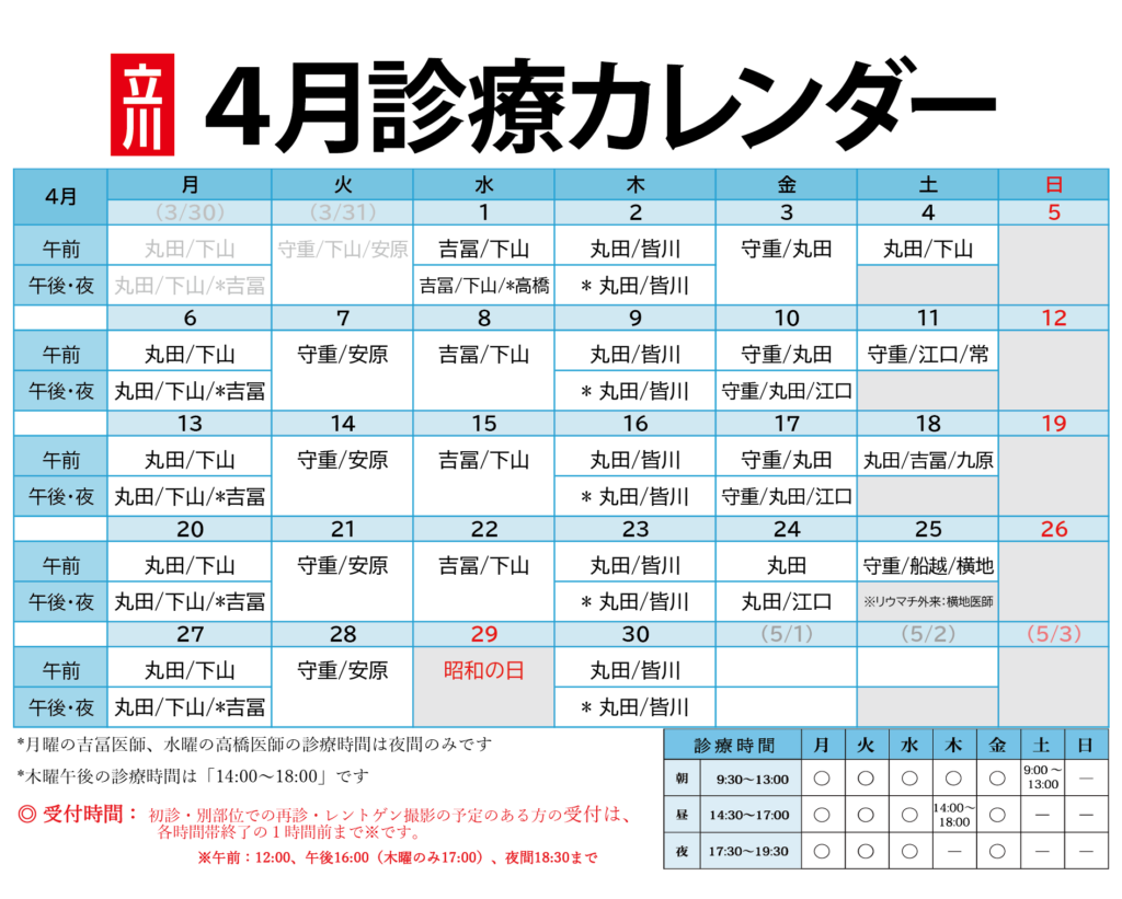 2026-03-02 / 最終更新日時 : 2026-03-02 morishige ニュース 4月の診療カレンダー 4月の診療カレンダーを公開しました。 4月より、医師の曜日が一部変更となりますのでご注意ください。