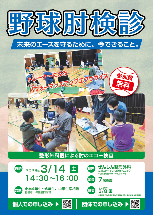 1月に実施いたしました肘検診につきまして、多くの方よりご好評をいただきましたため、3月14日(土)に追加で実施することとなりました