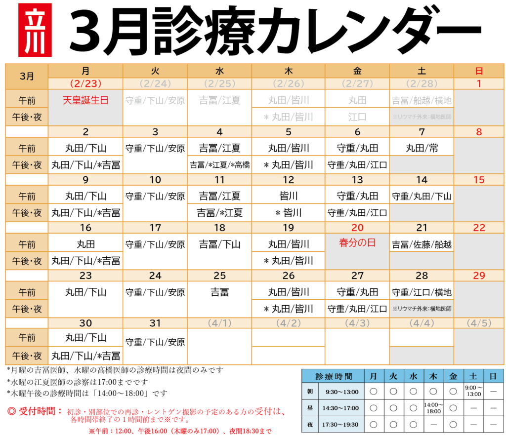 2026-02-03 / 最終更新日時 : 2026-02-03 morishige ニュース 3月の診療カレンダー 3月の診療カレンダーを公開しました。 4日、11日の江夏医師の診療は17:00までとなります。